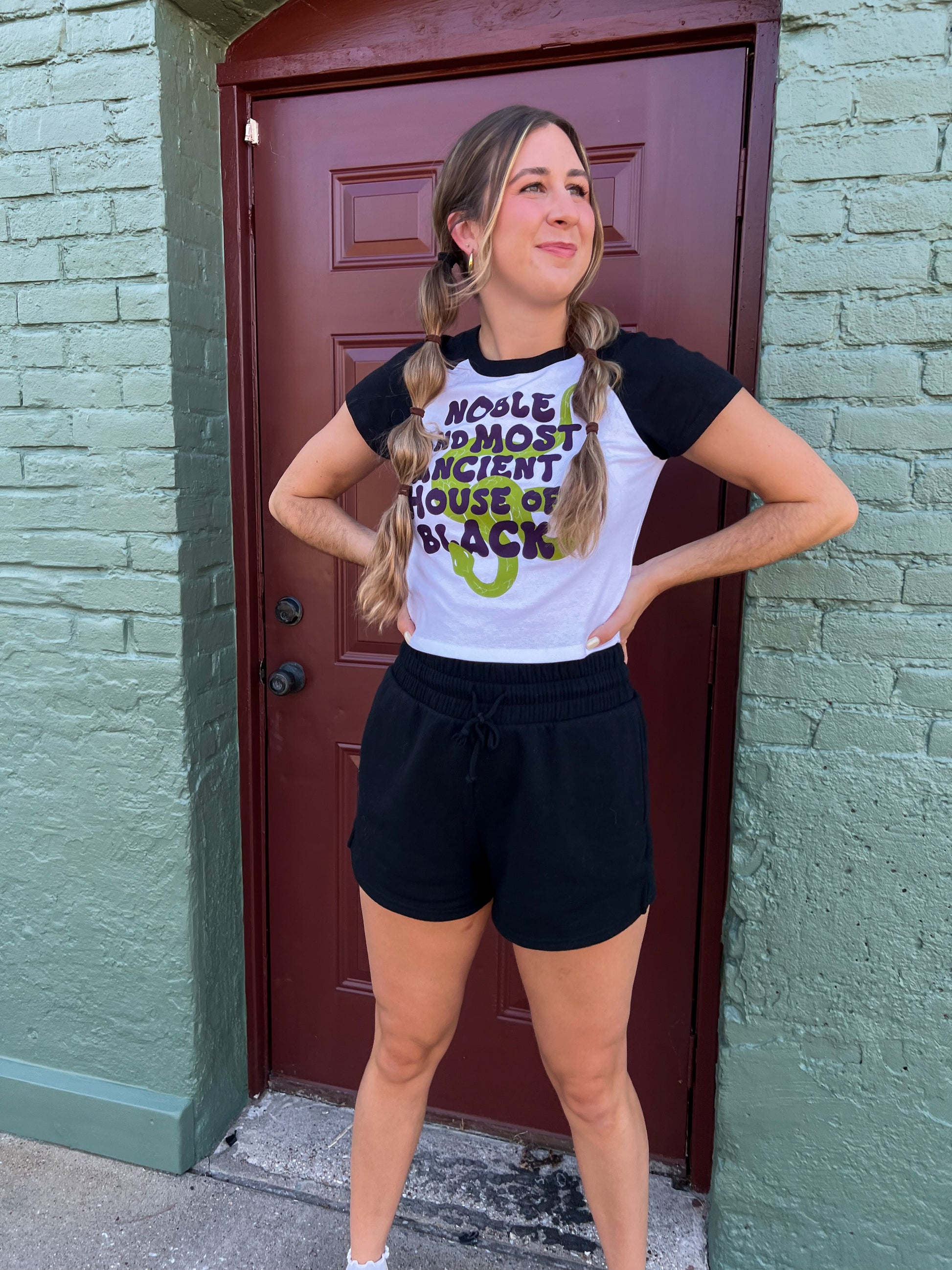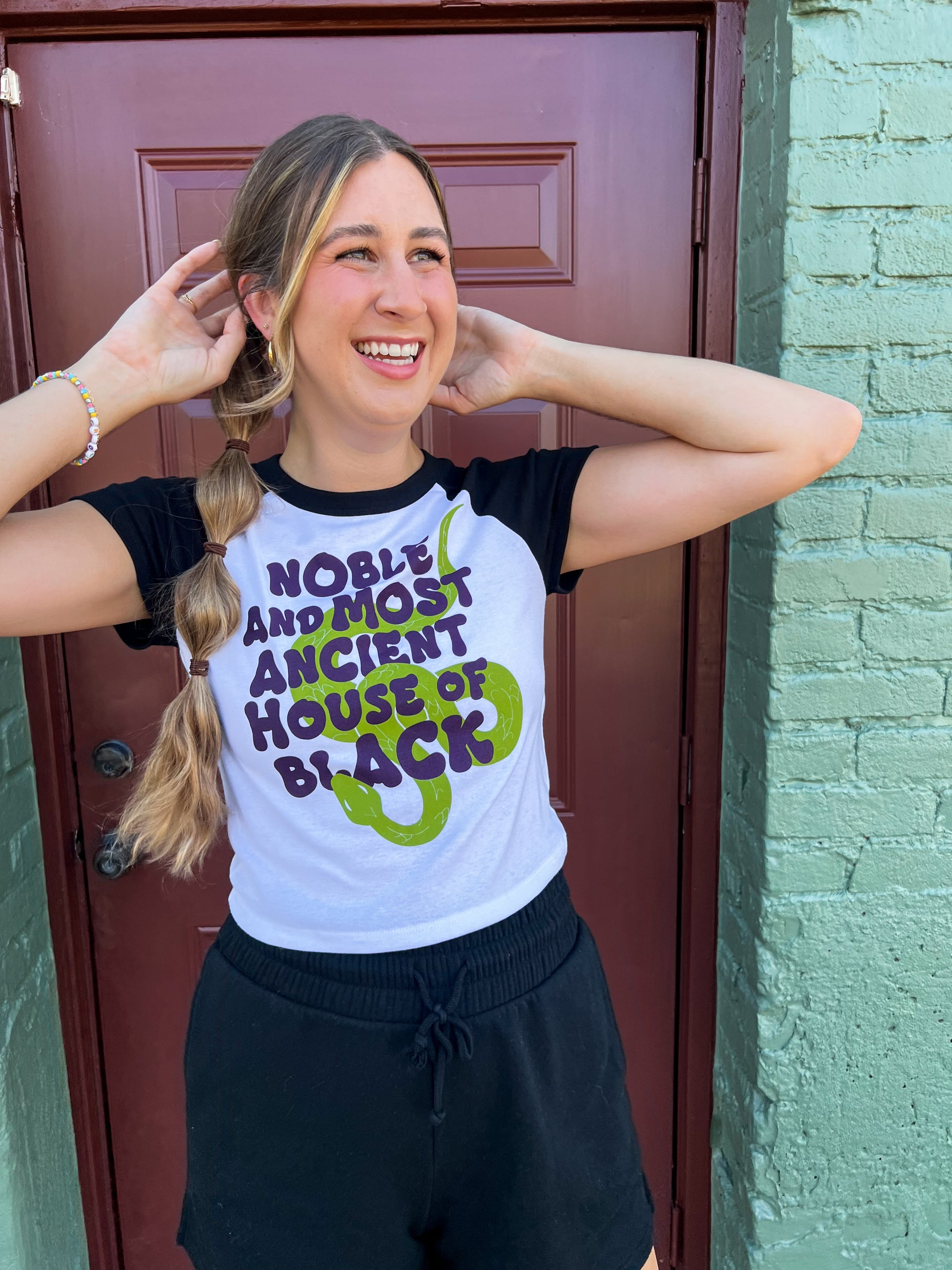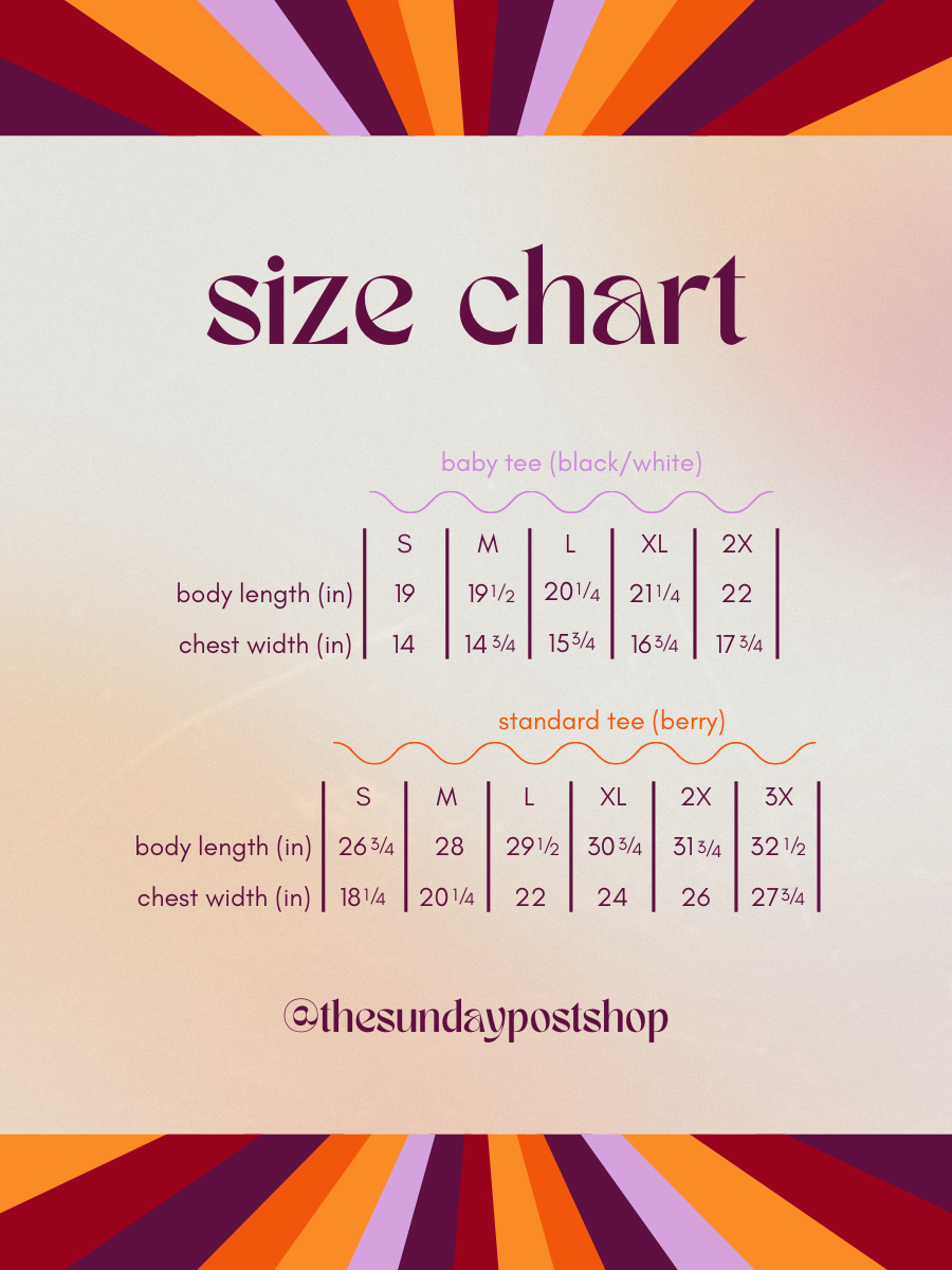 - Tee comes in two styles: standard unisex Comfort Colors tee in Berry, and a cropped baseball baby tee in Black/White