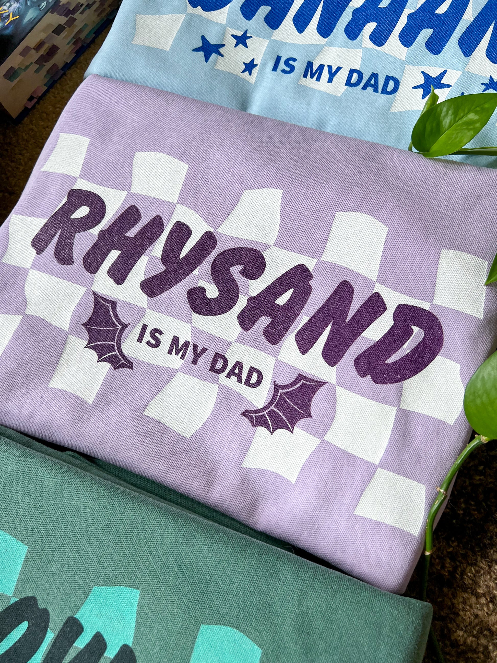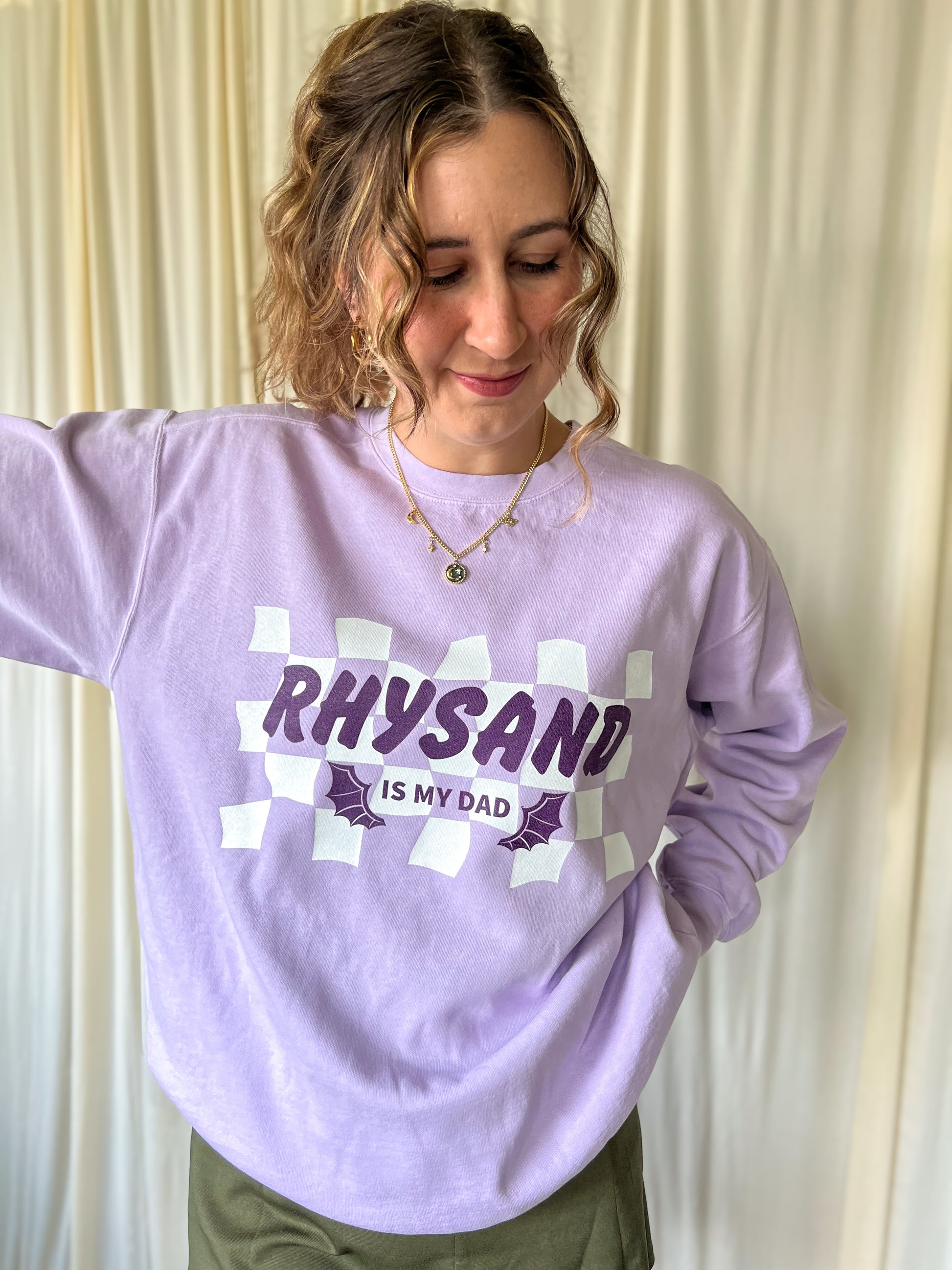 - Orchid garment-dyed sweatshirt; white and indigo print