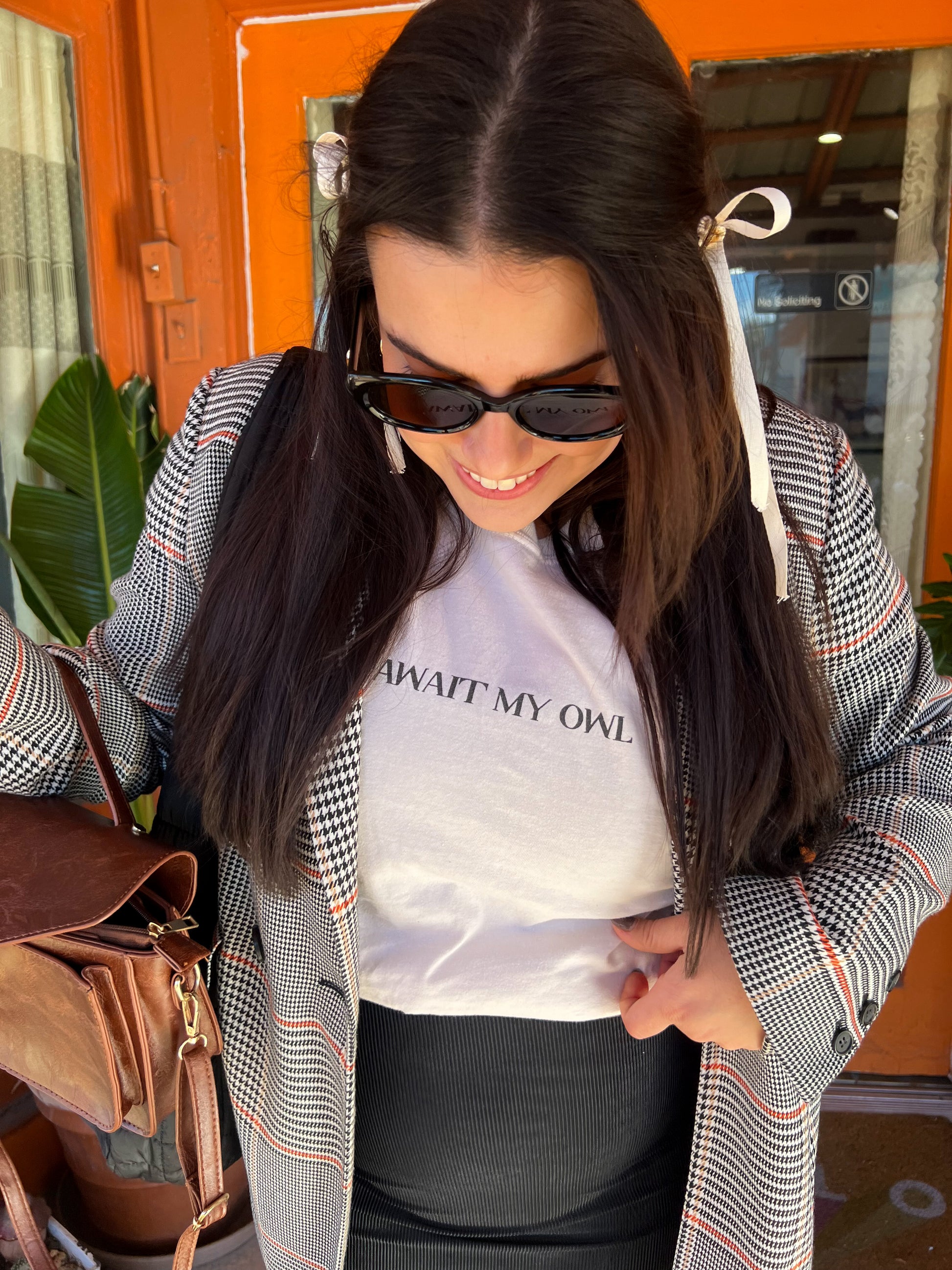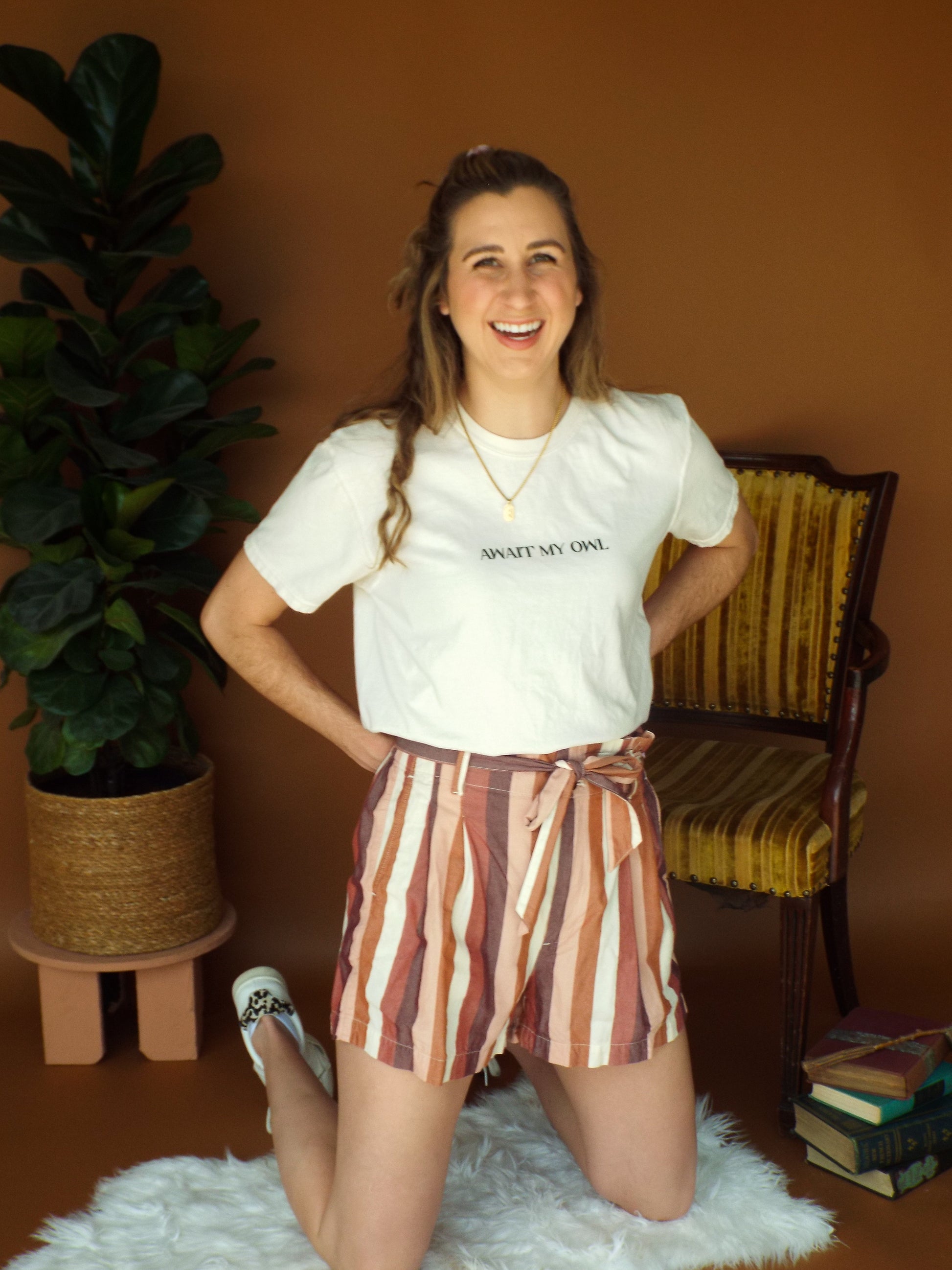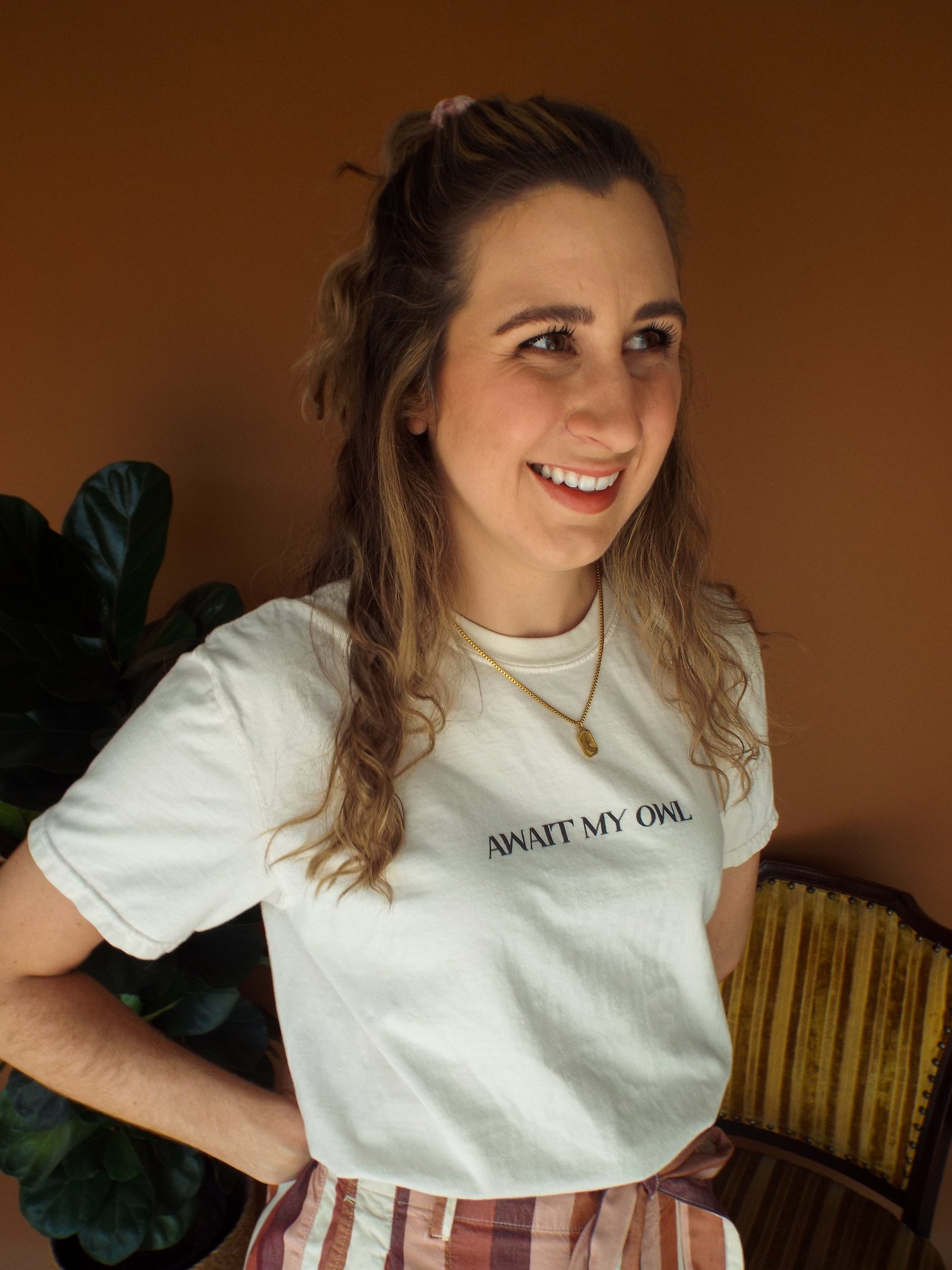 - Ivory tee with "Await My Owl" in black text