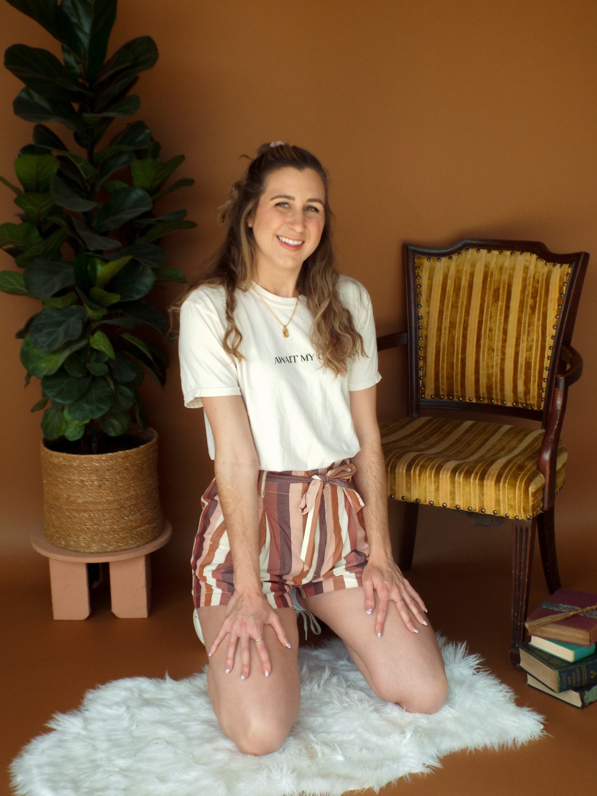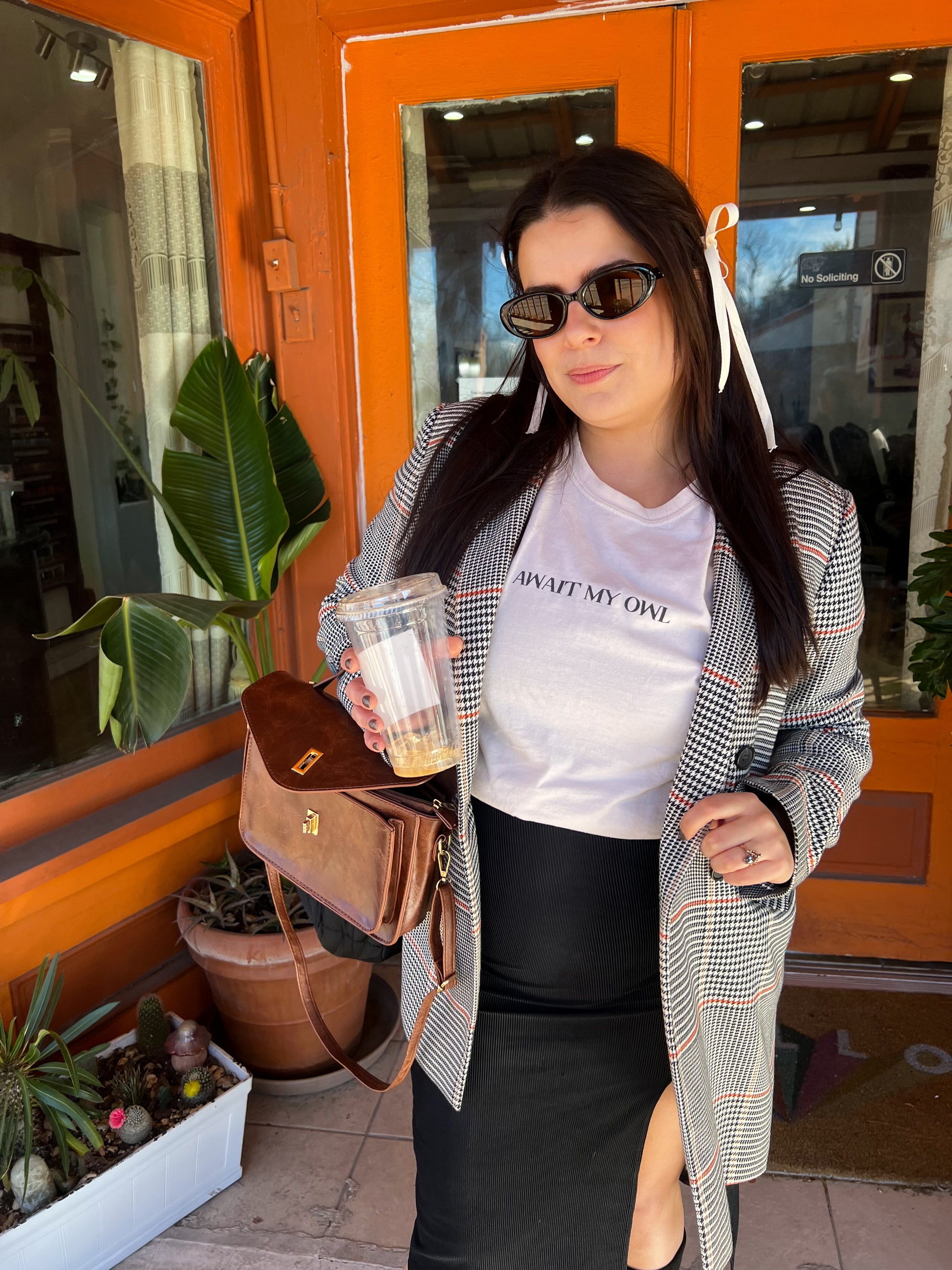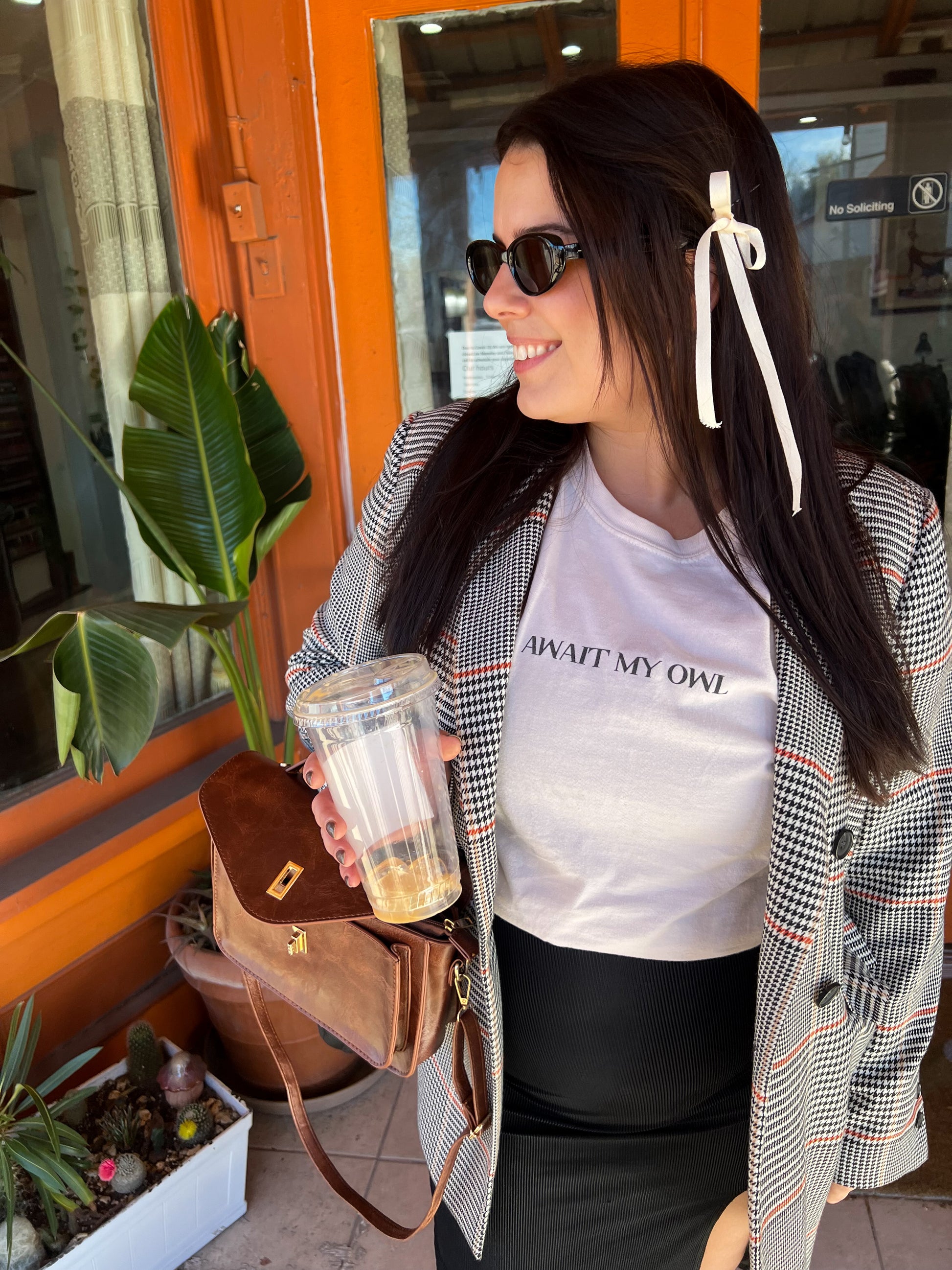 - Ivory tee with "Await My Owl" in black text