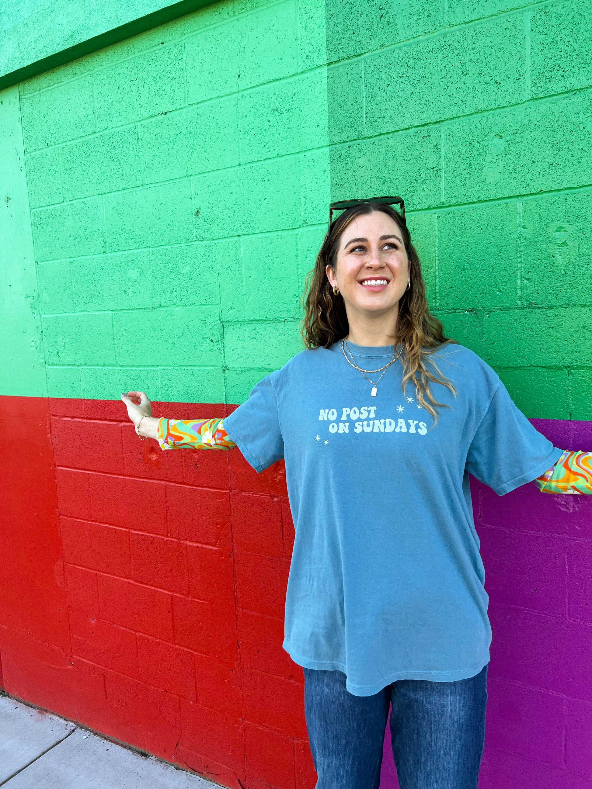- Stormy Blue tee with "No Post on Sundays" in white text