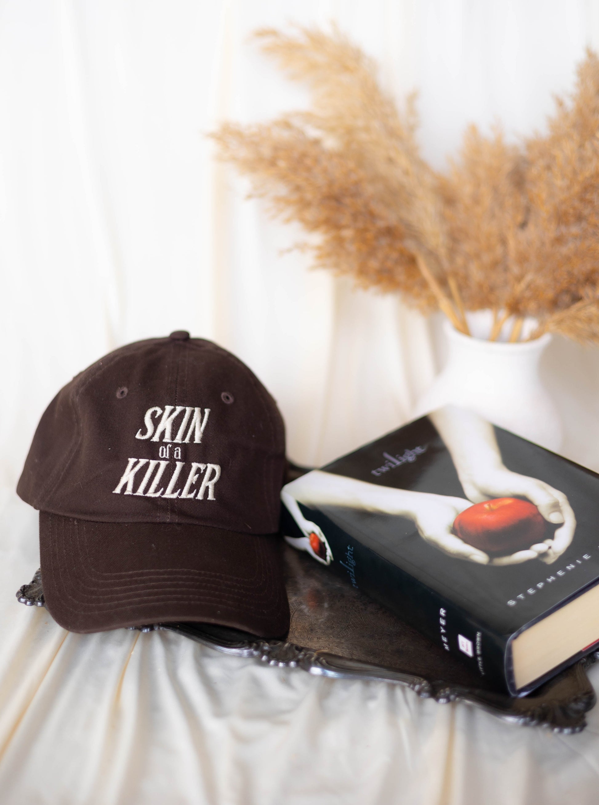 The Vamp Cap is a chocolate colored, 6-panel twill baseball hat. It has an adjustable fabric strap in the back with an antique bronze buckle, and "Skin of a Killer" embroidery in tan thread. It is your life now.